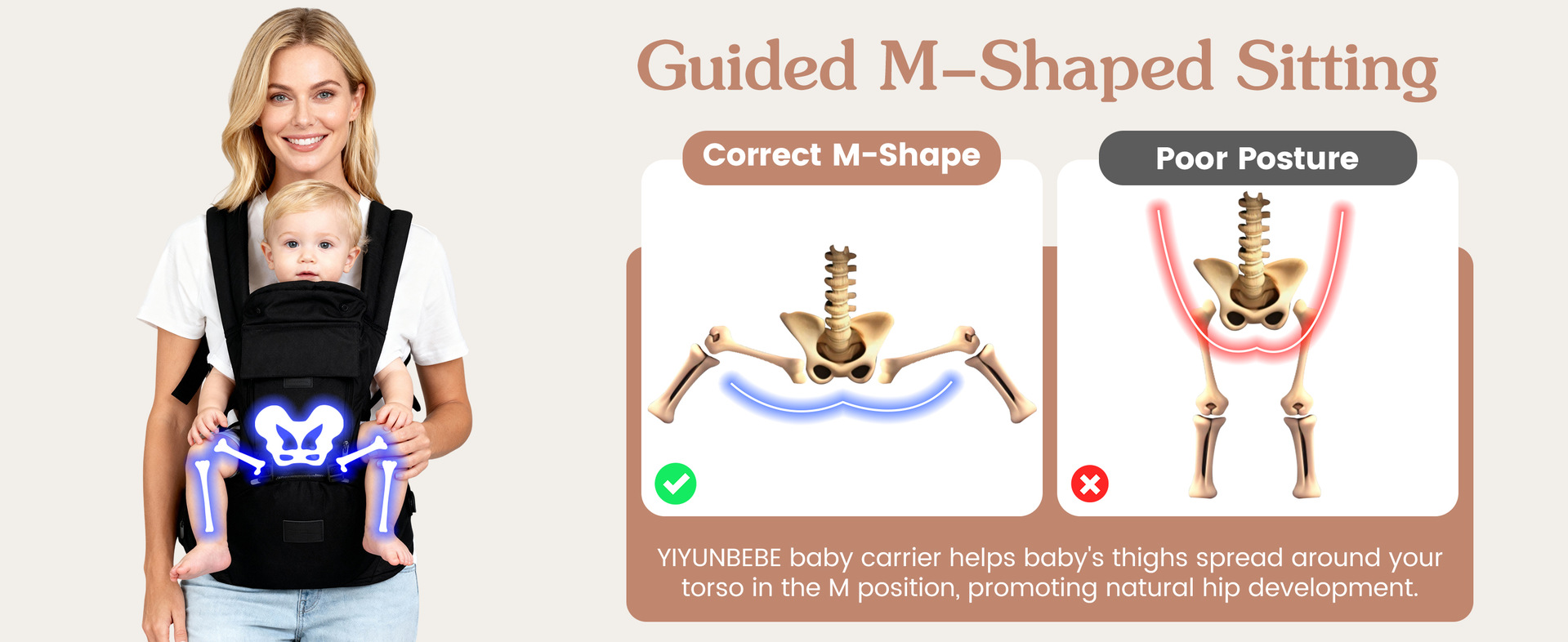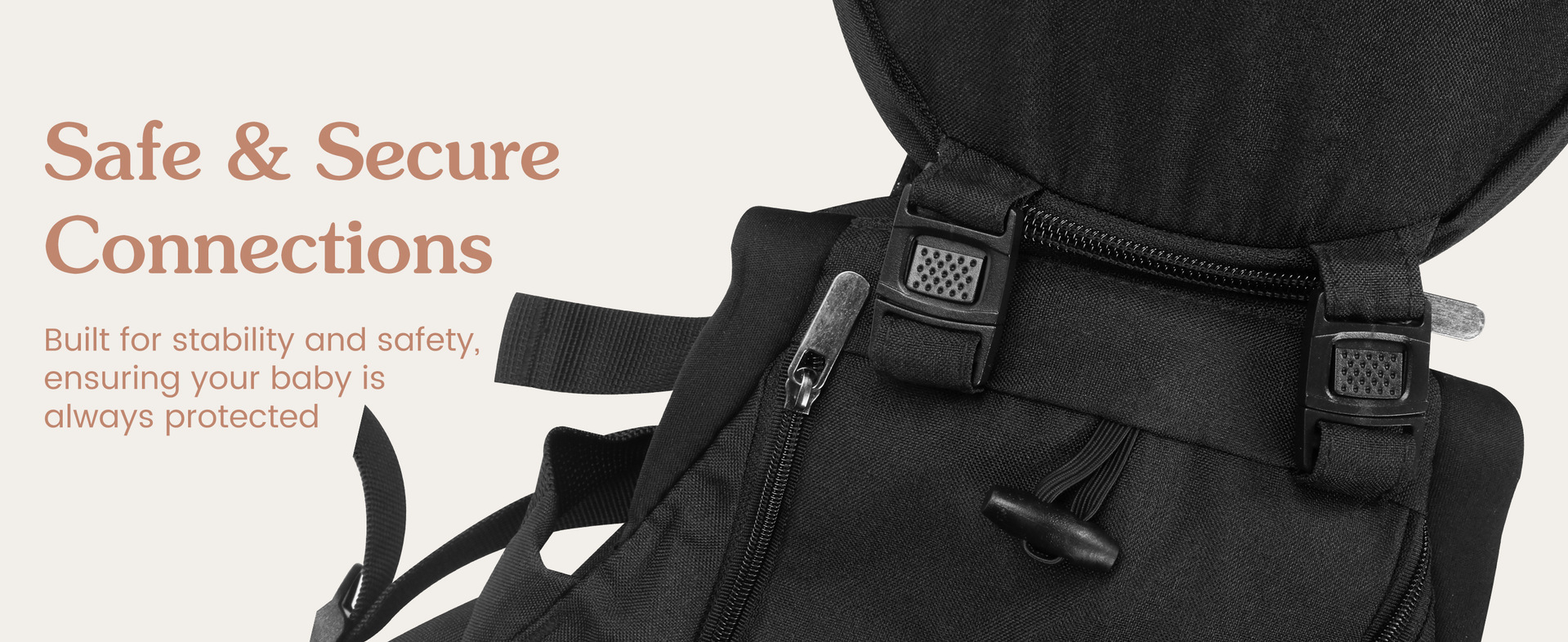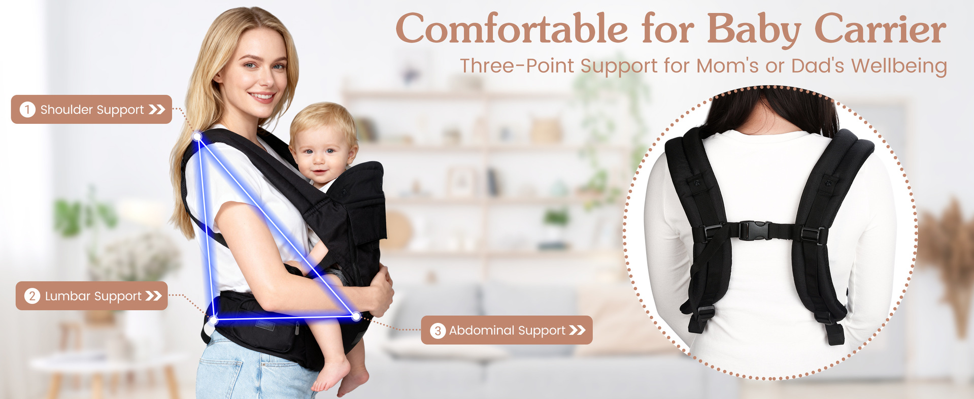 腰ベルトと幅広の肩ベルトで赤ちゃんの体重を分散し、長時間の抱っこでも疲れにくい設計になっています。
